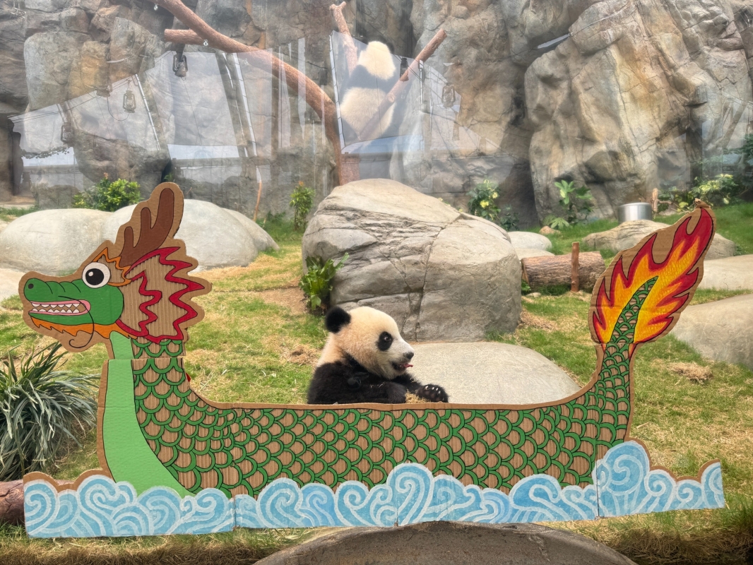 細佬“得得”。圖源:海洋公園 家姐“加加”和細佬“得得”在“奶爸、奶媽”悉心製作的龍舟佈置前,拎起船槳撐龍舟,萌爆造型睇到大家心心眼!“安安”和“可可”則對特製糉子愛不釋“口”,糉子加入了由黃色高纖餅乾和蕃薯製成的“蛋黃”,既美味又營養豐富。“盈盈”和“樂樂”則悠然自得,嘆住冰糉涼浸浸賀端陽。 此外,大熊貓家族更衝出公園同大家一齊玩轉端午節!“Panda Friends@香港海洋公園”今天起至6月8日驚喜現身尖沙咀星光大道,換上端午主題造型,與世界好友合影留念。同場之“Panda Friends@香港海洋公園”期間限定店,將發售專為今年香港國際龍舟邀請賽設計之紀念品,讓遊人將大熊貓家族帶回家歡度端午。 (完)(視頻來源:海洋公園) 【編輯:梁嘉軒】