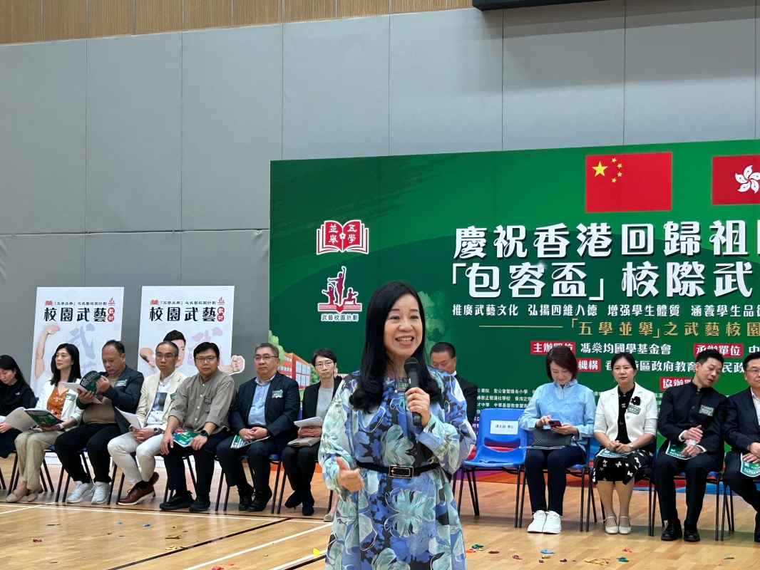 香港中通社圖片 馮燊均國學基金會主席鮑俊萍致辭時表示,基金會成立提出“五學並舉”主張,即經典、歷史人物、禮儀、書法、武藝,作為國學之入門。武藝不僅是強身健體的技藝,更是中華文化中修身、齊家、治國、平天下的精神載體。 國家教育部課程教材研究所所長宋凌雲致辭指,武術英雄霍元甲、葉問、李小龍等人的感人事跡,激勵著一代又一代的中華兒女,他們不僅用武術捍衛了民族尊嚴,更向世界展示了中華優秀傳統文化的博大精深。這些武術家的故事在香港廣泛流傳,計劃讓武藝在香港校園紮根,推動中華文化在校園開花結果。 港區全國人大代表、武藝校園計劃策劃人凌友詩致辭指,武藝除了強身,還有修身作用,不只是形體、肢體上的強壯,還能學會孝道、培養家國情懷,以及種種美德。