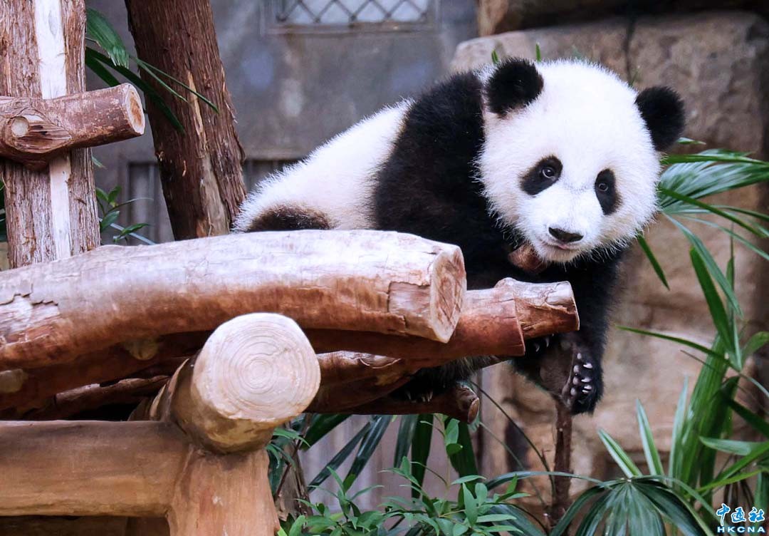 5月27日,香港海洋公園公佈在港出生的一對大熊貓龍鳳胎幼崽名字,雌性熊貓寶寶名字為“加加”,雄性熊貓寶寶名字為“得得”。“加加”有加油打氣的意思,粵語和普通話又與“家”和“加”同音,有美好的意思,寓意家國騰飛、人民幸福。而“得得”意指“事事都得”,亦有中國人崇尚的美“德”,寓意國寶大熊貓具備中國人崇尚的美德。圖為大熊貓“加加”。(中通社 呂真好攝)