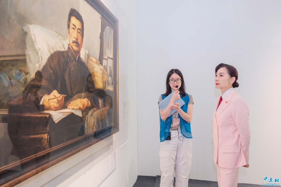 5月30日,香港珠海社團總會會長鄺美雲(右)在香港會展中心參觀“其命惟新——廣東美術百年大展(香港)”。(香港中通社記者 許其皓攝)