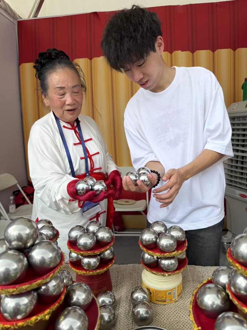 “保定有三寶:鐵球、面醬、春不老”。保定健身球又名保定鐵球,歷史悠久,迄今已有800多年歷史,是河北保定傳統的漢族民間工藝品,2016年,保定鐵球被河北省政府列入省級非物質文化遺產名錄。 外國遊客被保定鐵球吸引,并饒有興致現場學了起來。不少年輕人也在河北青年會的介紹下,了解保定鐵球的歷史、功效,并認真體驗。