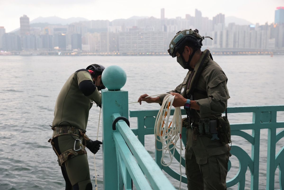 香港警方特別任務連(飛虎隊)水鬼隊下水搜索涉案的證物。