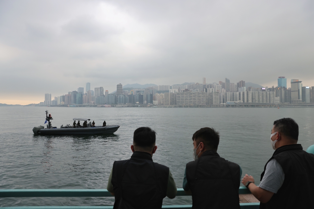 港警國安處拘捕1男4後在海面搜索涉案證物。