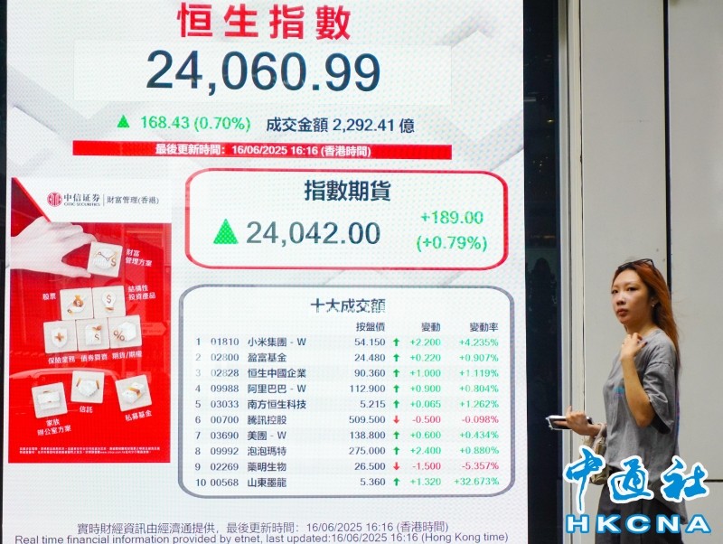 香港中通社6月16日電 市場關注中東局勢,美股期貨升。港股16日低開高走,恒生指數當日升168點或0.7%,重上24000點關口,報24060點;大市全日成交約2292.4億港元。