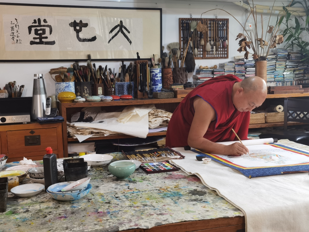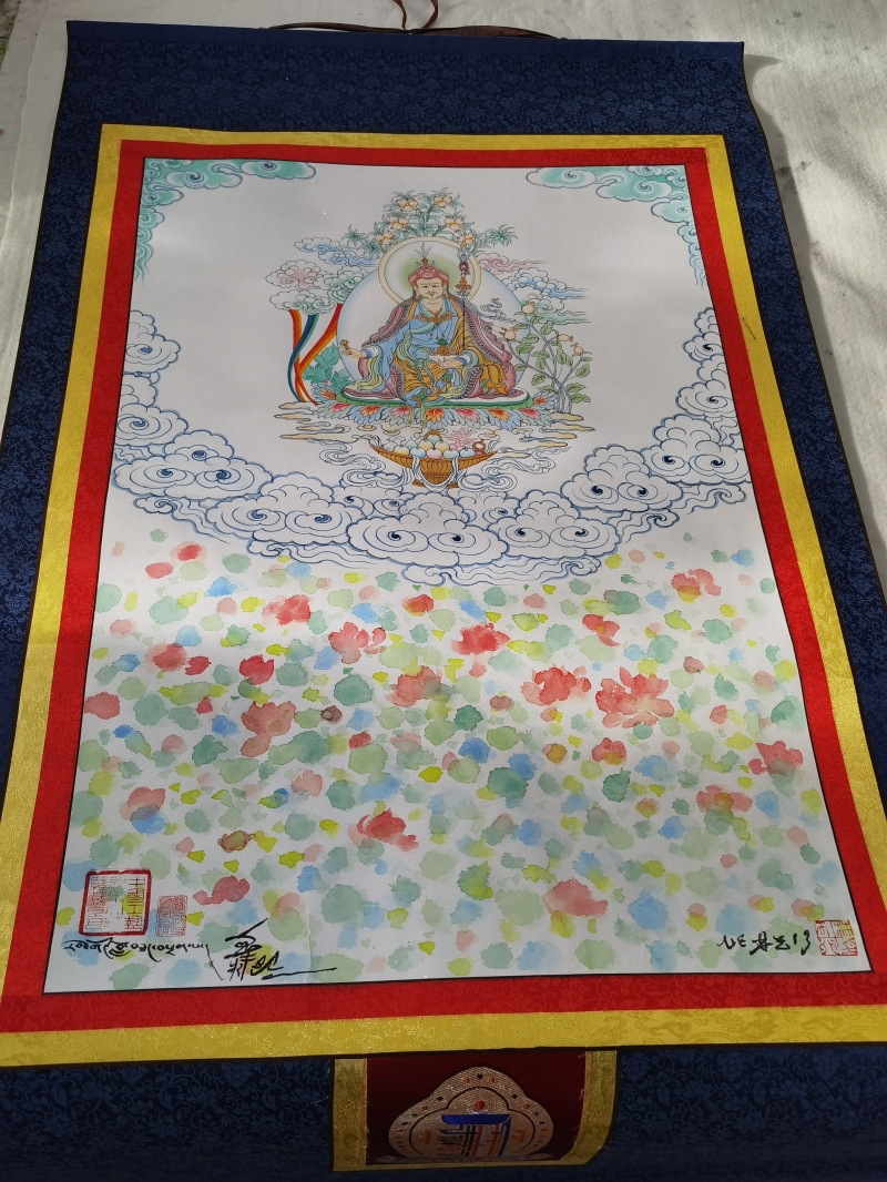 這幅畫卷中,下半部分是極具寫意的水墨畫蓮花,上半部分是唐卡工筆描繪的佛教高僧;藍色祥雲與粉紅蓮花環繞佛像,水墨的疏狂再添幾分別樣美感。