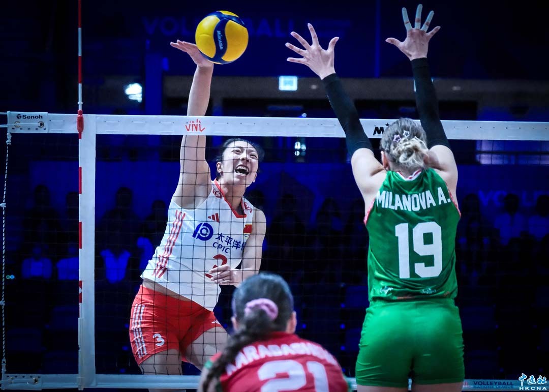 6月19日,世界女排聯賽香港站第二個比賽日,中國隊以3:2戰勝保加利亞隊。圖為中國隊隊員唐欣扣球。(香港中通社記者 許其皓攝)