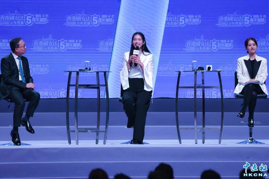 6月21日,香港國安法公布實施五周年論壇在香港會議展覽中心大會堂舉行,論壇下午舉行座談環節。圖為2024年巴黎奧運金牌得主江旻憓(中)出席第二節座談會並發言。(香港中通社記者 謝光磊攝)