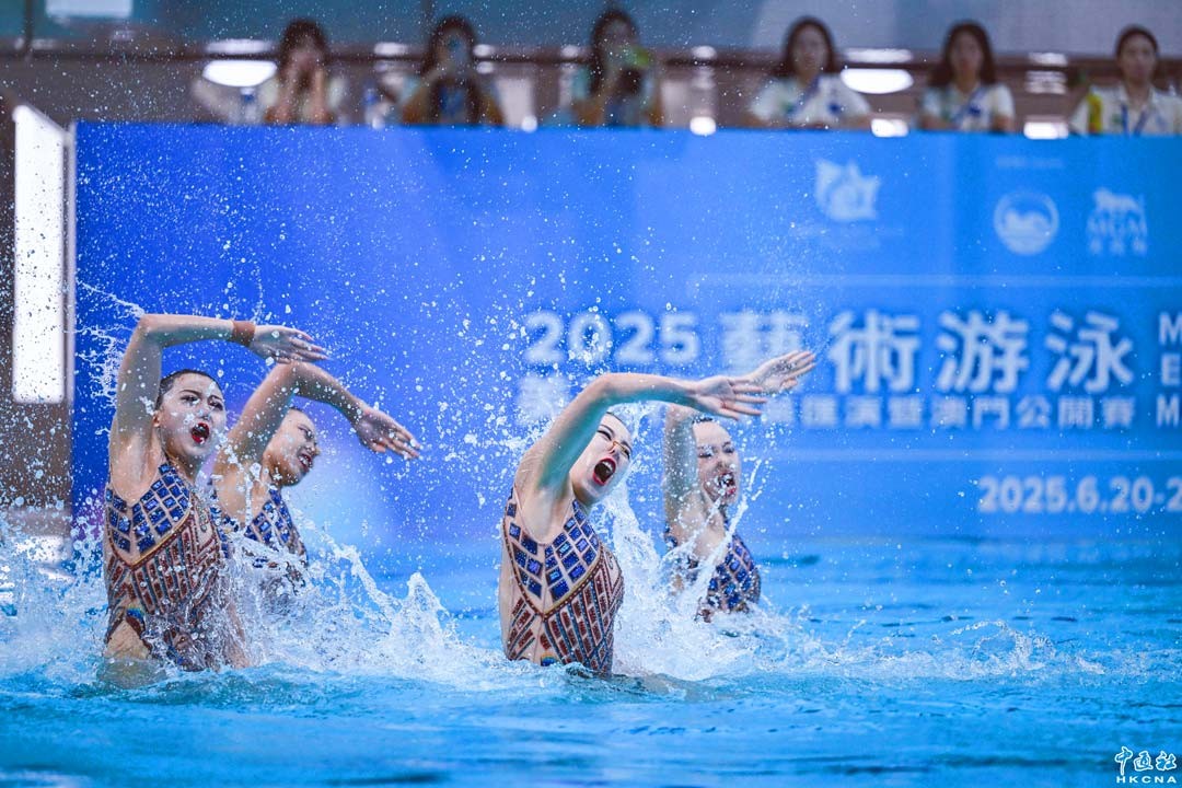 6月22日,2025美高梅藝術游泳精英匯演暨澳門公開賽在氹仔奧林匹克泳館圓滿結束。賽事完成後,隨即上演精英匯演,包括去年獲得巴黎奧運金牌的王柳懿、王芊懿在內,國家隊、北京隊及廣東隊等多名精英運動員,先後為現場觀眾送上多場精彩花泳演出,現場氣氛熾熱。香港中通社圖片