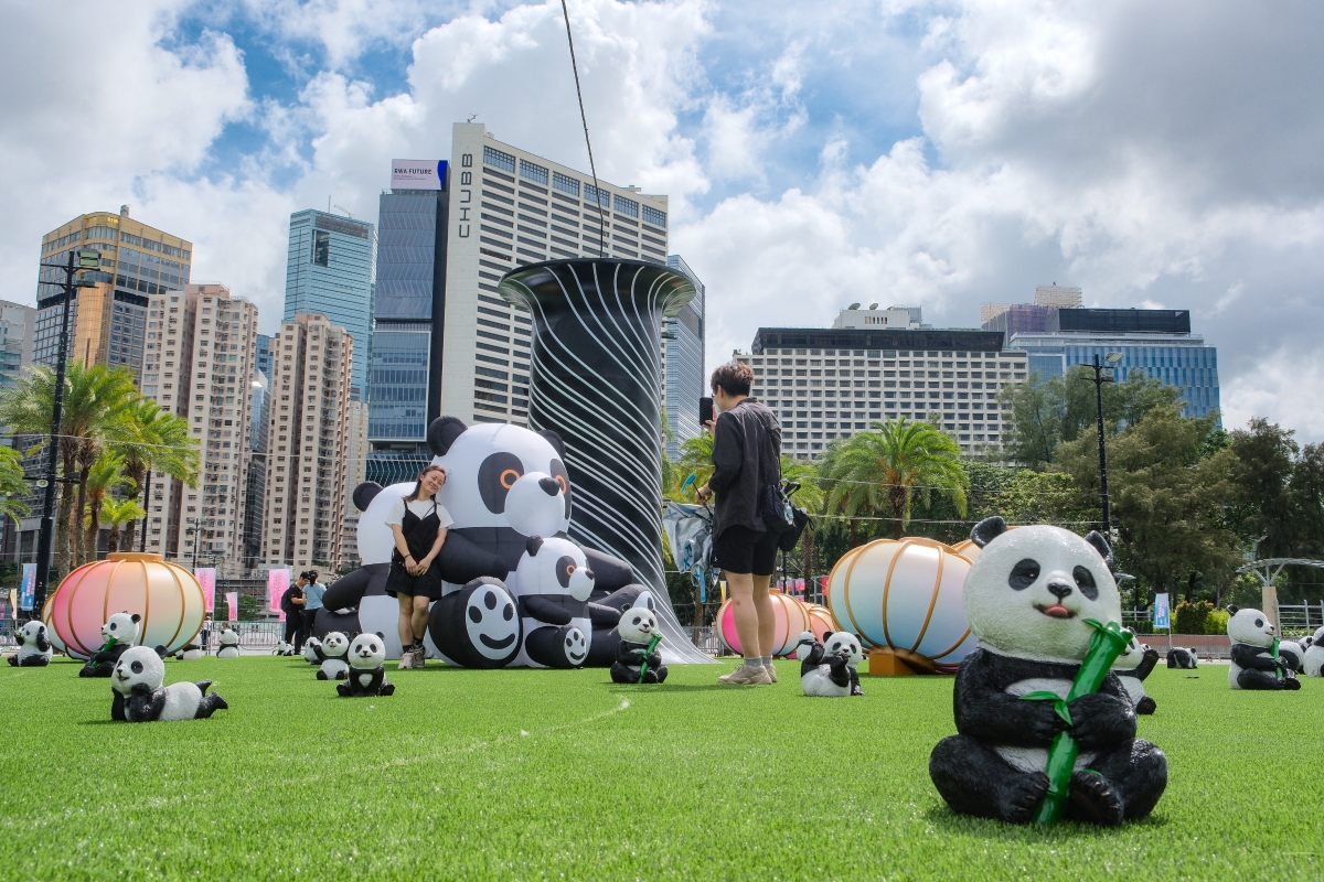 展區以“親親大熊貓”為主題,設有兩米高的大熊貓裝置與100隻小型熊貓裝置。