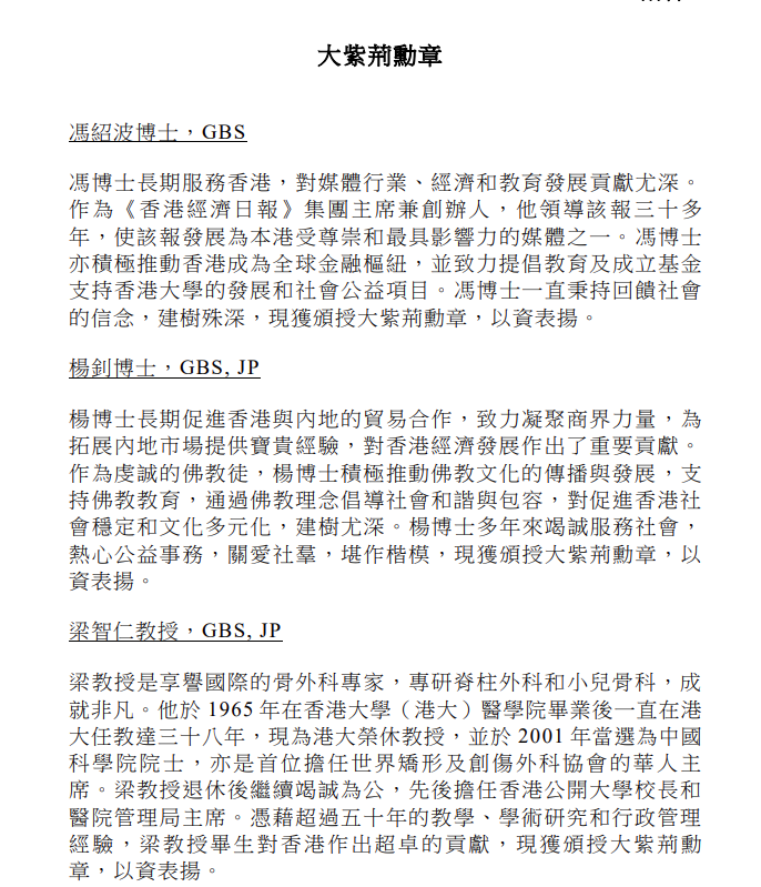 圖源:香港政府新聞網文件截圖 今次共3人膺大紫荊勳章,包括《香港經濟日報》集團主席兼創辦人馮紹波,香港旭日集團董事長、香港中華總商會永遠榮譽會長楊釗,前醫管局主席、香港公開大學榮休校長、香港大學榮休教授梁智仁。 律政司司長林定國,前警務處處長蕭澤頤,全國政協人口資源環境委員會副主任蔡加讚,恒基地產副主席林高演,香港特區維護國家安全委員會秘書長區志光等20人獲頒金紫荊星章。 前海關關長何珮珊、巴黎奧運女子重劍金牌得主江旻憓等29人獲頒銀紫荊星章。立法會議員鄭泳舜,房屋署副署長楊耀輝,立法會議員、港協暨奧委會副會長霍啟剛等46人獲頒銅紫荊星章。 此外,12人獲頒紀律部隊及廉政公署卓越獎章,3人獲頒銅英勇勳章,46人獲頒紀律部隊及廉政公署榮譽獎章,111人獲得榮譽勳章,76人獲得行政長官社區服務獎狀,81人獲得行政長官公共服務獎狀。 另外,共66人獲行政長官委任為太平紳士,當中48人獲委任非官守太平紳士,18人獲委任官守太平紳士。 太平紳士的主要職能是巡視懲教院所、羈留中心或其他院所,以確保其有效管理,以及沒有任何人士被不公平對待或被剝削權利。太平紳士確保個別人士所作的投訴,會以公平和具透明度的方式處理。 行政長官李家超祝賀所有得獎人士,感謝他們為香港作出重大貢獻,希望他們繼續在其範疇盡展所長、服務社會。 李家超感謝九位為維護國家安全作出了卓越貢獻的人員,他們在面對外部勢力針對性惡意攻擊打壓的環境下,堅定不移、無畏無懼履行職責,積極參與落實香港國安法和維護國家安全條例有關工作,貢獻宏大,應頒授勳銜予以表揚。 他特別提到,去年4月10日在佐敦華豐大廈發生三級火警導致多人傷亡,感謝兩位市民英勇協助救出多名受困居民,因此向該兩位市民頒授銅英勇勳章;亦藉此機會感謝於今年3月至4月前赴緬甸地震災區協助搜救工作的香港特區救援隊人員的貢獻,因此向他們頒授行政長官社區服務獎狀及行政長官公共服務獎狀。(完) 【編輯:彭玉婷】