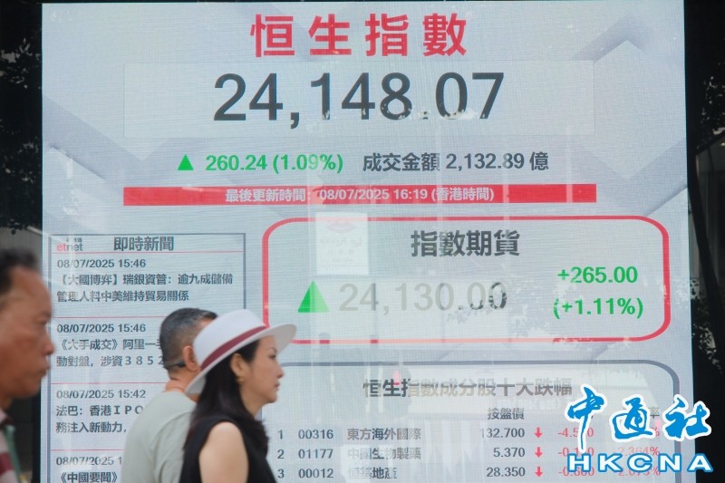 香港中通社7月8日電(記者 徐嘉儀)美國總統特朗普簽署行政命令,延長所謂“對等關稅”暫緩限期,港股經過連跌3天後回升。恆生指數8日報24148點,升260點。大市成交額為2132億港元。