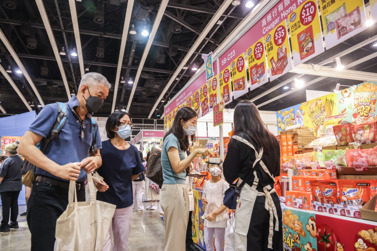 市民在香港運動消閒博覽及零食世界攤位選購。