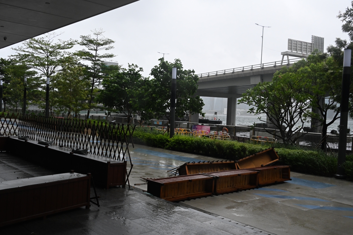 一家咖啡館的圍欄被強風吹踏