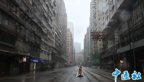 香港中通社圖片。 兩小時後,隨著風力再增強,天文台將信號升級為十號。根據定義,颱風以上級數的熱帶氣旋在香港100公里內掠過,持續風速每小時118公里或以上,便會發出十號颶風信號。 上午10時,颱風“韋帕”集結在香港天文台之東南偏南約60公里,天文台在香港東南端的橫瀾島錄得最高持續風速為每小時126公里。氣象圖路徑顯示,“韋帕”預計向西或西北偏西移動,橫過香港以南水域。 十號風球生效期間,港鐵已暫停所有露天段列車服務,巴士路線暫停。市區仍有市民出門遛狗,在大型屋苑樓下的商場內,連鎖快餐店仍營業,不少市民下樓買早餐。 颶風吹襲下,有居住在高樓層市民稱吊燈微微晃動,落地玻璃伴隨強風發出震動聲音。 截至20日上午10時,特區政府收到85宗塌樹報告。在九龍居民區,有市民自發在紅綠燈路口移開被風吹折的樹枝。(完) 【編輯:譚暢】