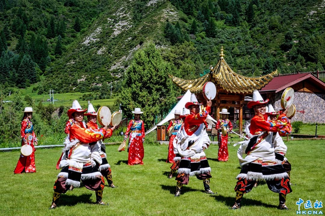甘肅甘南卓尼縣,藏族兒女展示特色傳統服飾。圖為一名表演“巴郎鼓”舞的藏族小伙。該舞蹈藏語稱“莎姆”舞,意為廣場上表演的一種祈禱平安的舞蹈。(香港中通社記者 譚暢攝)