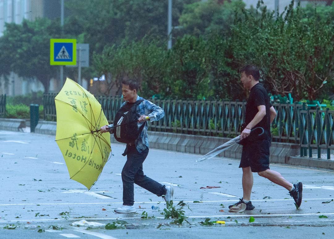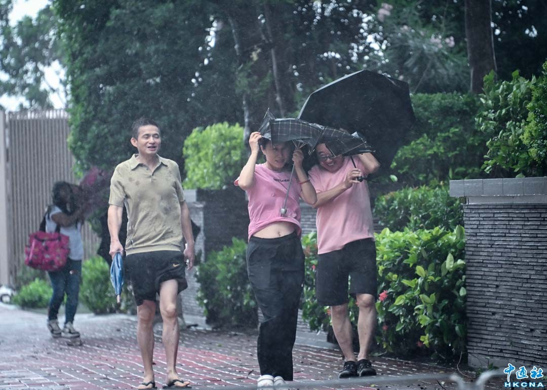 7月20日早上,香港市區受到台風“韋帕”影響,市民在狂風暴雨下,舉步維艱。九號烈風或暴風風力增強信號現正生效。 天文台表示,台風“韋帕”未來數小時最接近香港,會視乎本地風力變化,評估是否需要發出十號飓風信號。天文台表示,上午9時“韋帕”集結在香港天文台東南約70公里,時速約25公里,靠近珠江口一帶,香港風力正進一步上升。 (香港中通社記者洪少葵攝)