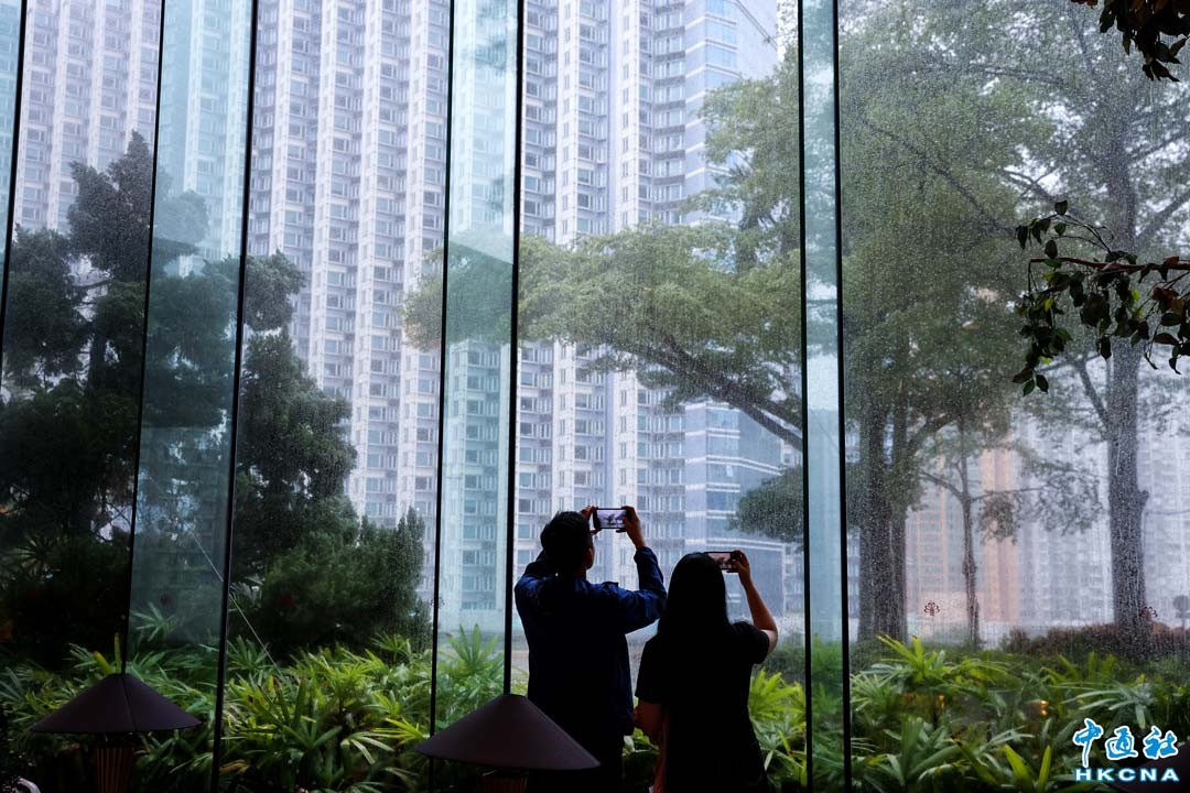 7月20日,香港天文台在上午9時20分改發十號颶風信號。香港天文台表示,颱風“韋帕”未來數小時最接近本港。圖為當日,香港市民室內拍攝颱風。(香港中通社記者 謝光磊攝)