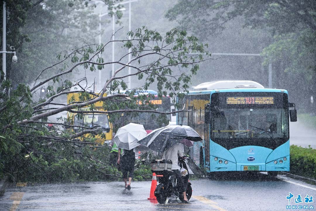 7月20日,受今年第6號台風“韋帕”影響,深圳局地遇險。大樹連根拔起、樹枝折斷墜落、路段積水,有關搶險人員在暴風雨中排險。圖為位於深南大道西南側輔道一棵大樹被台風吹倒,一度影響交通,深圳園林綠化搶險隊員正在排險處置。(香港中通社 陳文攝)