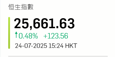 香港新聞網7月24日電  港股24日上午交易時段繼續造好,延續連升5日的趨勢。港股24日開市略為回吐,恆生指數低開9點或0.04%,其後再創逾3年半高位,高見25735點,升約200點。