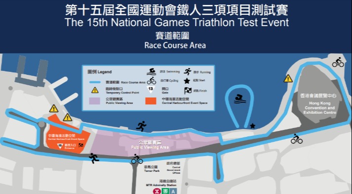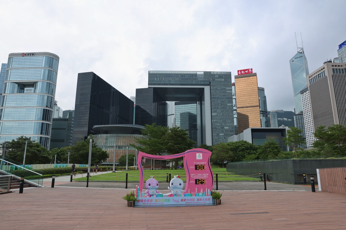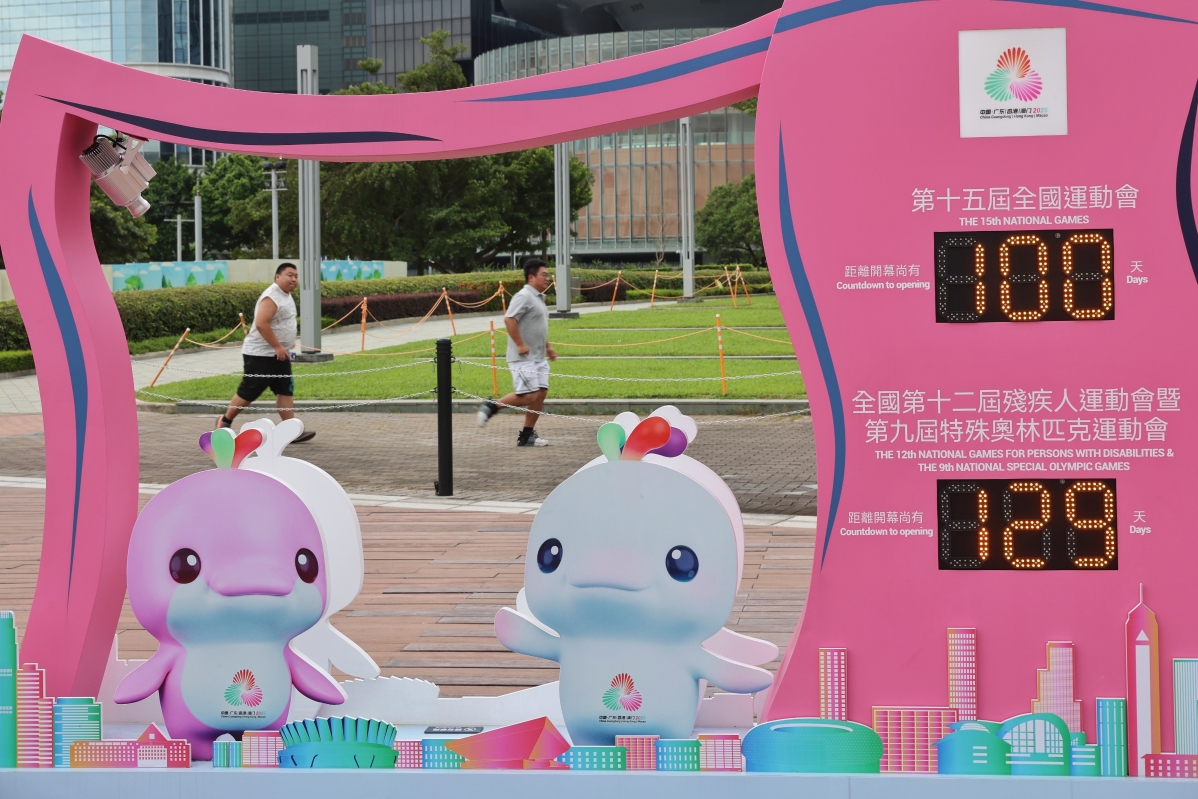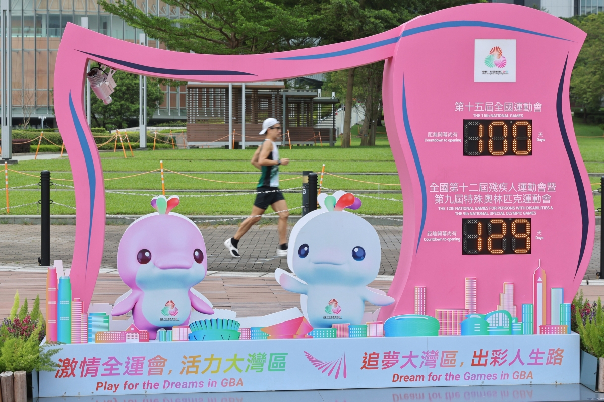 市民在添馬公園第十五屆全國運動會倒計時牌後慢跑