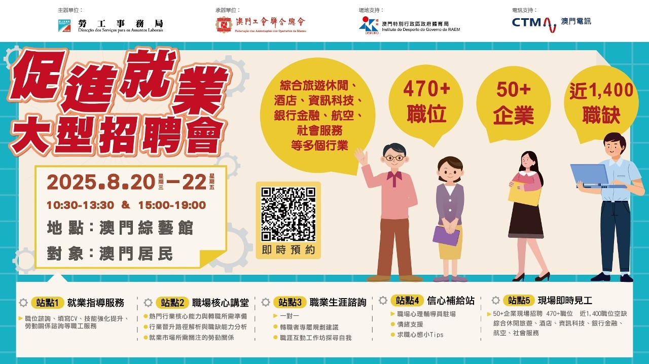 香港新聞網8月4日電 為全力促進各階層求職者對接就業及助力居民向上流動,由澳門特區政府勞工事務局主辦、澳門工會聯合總會承辦的促進就業大型招聘會將於8月20日至22日在澳門綜藝館舉行,現場提供近1400個職缺、約470多個職位供求職者選配和即場面試。