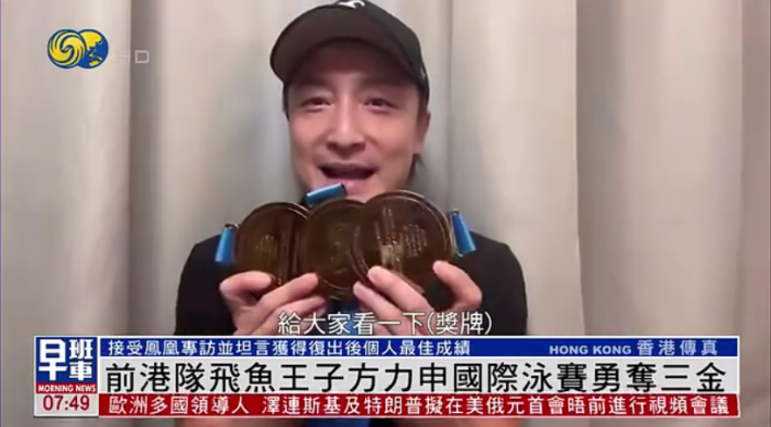 香港新聞網8月12日電 在香港被稱為“飛魚王子”的前港隊游泳運動員方力申,在新加坡舉行的世界先進游泳錦標賽中勇奪三金。他在接受鳳凰獨家專訪時表示,在這三項賽事中都游出了復出後的個人最佳成績,同時感謝家人和懷孕太太帶來的好運。 現年45歲的香港藝人方力申,已參加過兩屆世界先進游泳錦標賽,曾獲得一銀一銅,今年再度赴新加坡參賽,並先後斬獲三枚金牌。