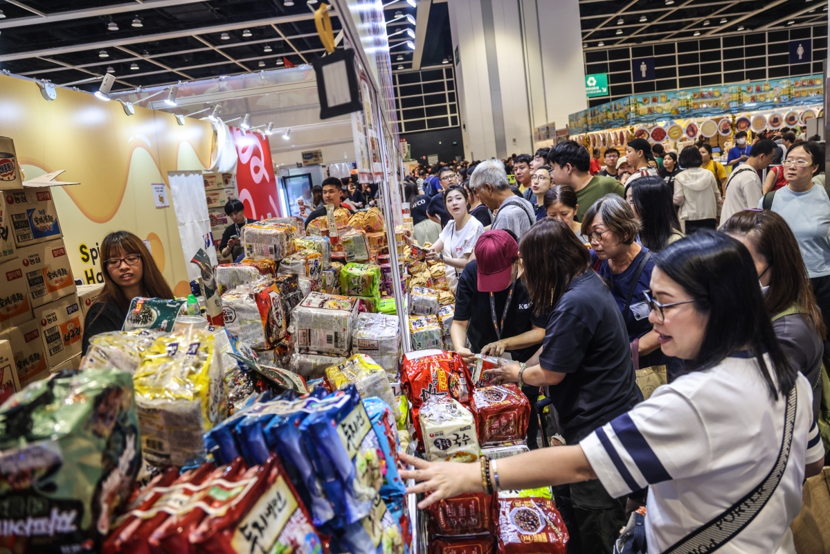 香港新聞網8月14日電(記者 曹文毓)8月14日,香港美食博覽、美食商貿博覽、香港國際茶展、美與健生活博覽、家電‧家居‧博覽於會展中心開幕,5個展覽匯聚多達1890個展商,不少商戶推出優惠,吸引大批市民入場前往美食博覽現場“掃貨”。 當天早上受熱帶氣旋“楊柳”影響,多區下起大暴雨,天文台發出最高級別的黑色暴雨警告信號。原訂上午10時開幕的美食博覽,在黑雨信號除下後兩小時,即下午1時許開放予公眾入場。