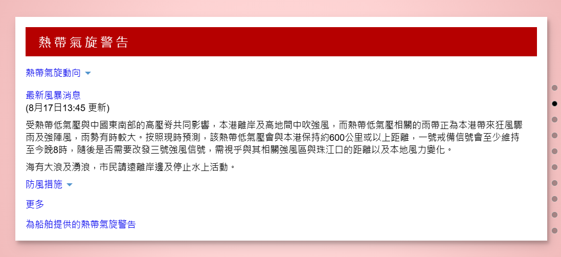 天文台表示,受熱帶低氣壓與中國東南部的高壓脊共同影響,香港離岸及高地間中吹強風,而熱帶低氣壓相關的雨帶正帶來狂風驟雨及強陣風,雨勢有時較大。按照現時預測,該熱帶低氣壓會與香港保持約600公里或以上距離,一號戒備信號會至少維持至今晚8時,隨後是否需要改發三號強風信號,需視乎與其相關強風區與珠江口的距離以及本地風力變化。  (完)
