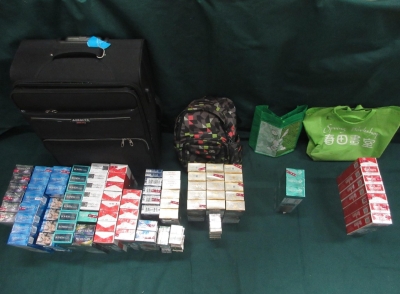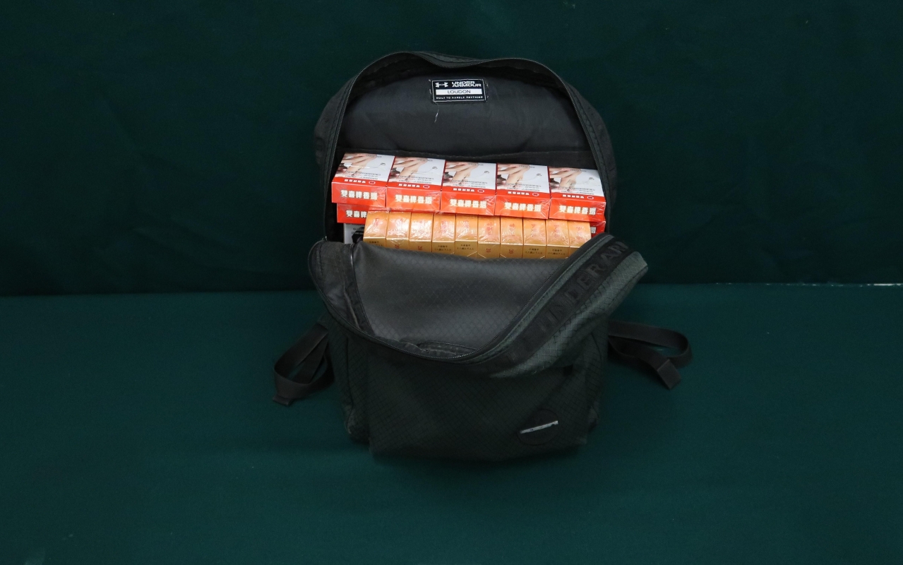 圖示在其背包內檢獲的未完稅香煙。 海關人員於8月15日在香園圍管制站截查一名59歲的抵港女旅客,並在她的個人行李內檢獲3181支未完稅香煙,市值共約1.43萬元,應課稅值共約1.05萬元。該名旅客隨即被捕。