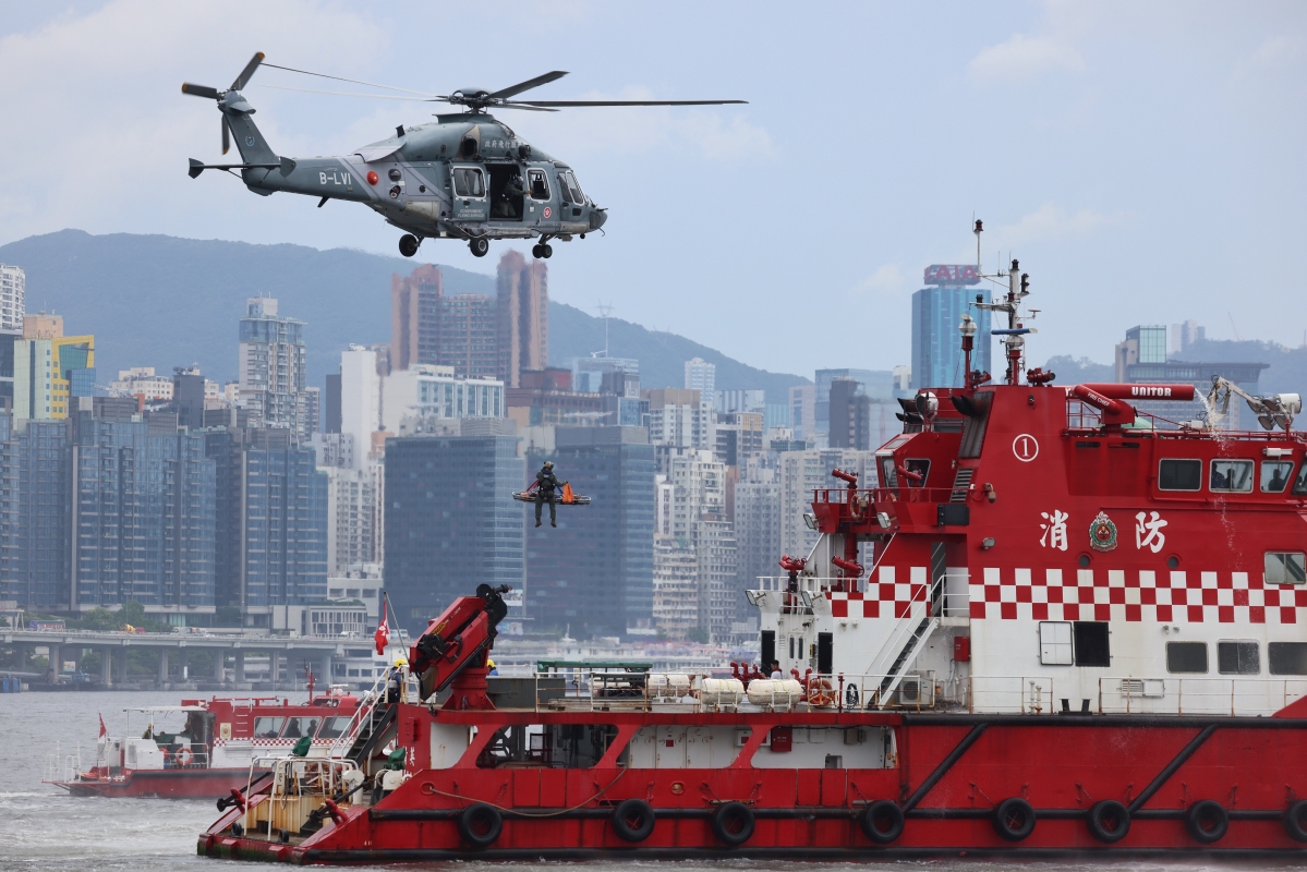 演習模擬消防處召喚政府飛行服務隊直升機到場協助運送傷員。