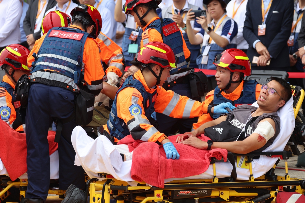 演習模擬消防處接報後派出多架救護車及流動傷者治療車到場救助現場傷者。