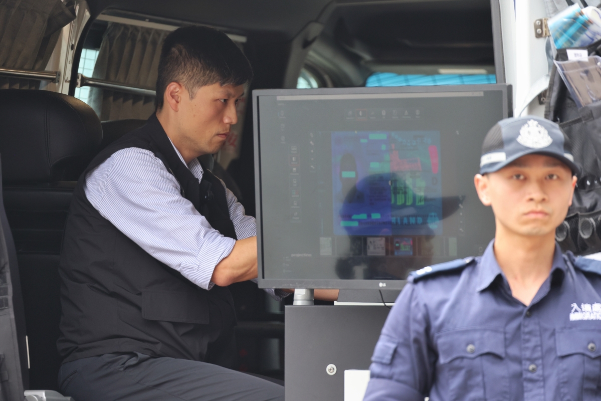演習模擬入境處收到警方通知後,出動流動鑑證戰術車到場協助查驗證件真僞。