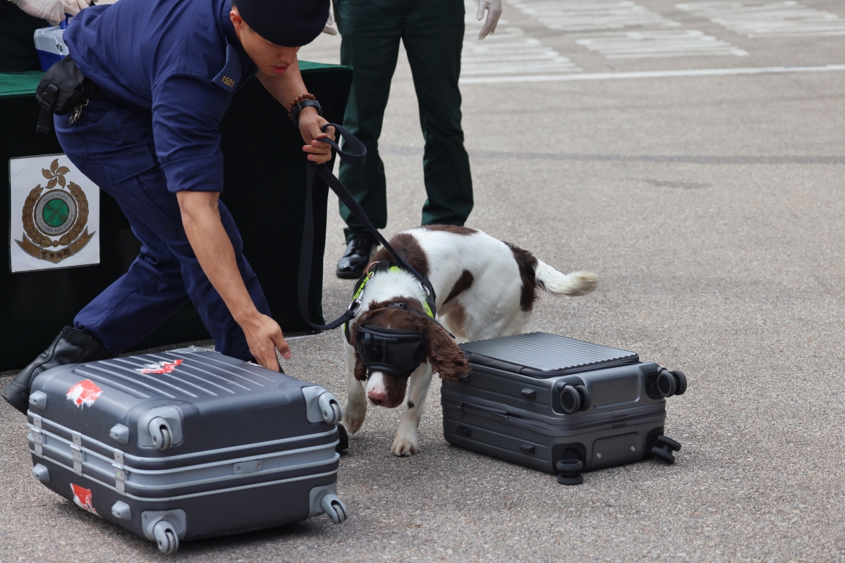 演習模擬海關人員在碼頭前沿區為未進行入境手續旅客的寄倉行李進行風險檢查,包括利用海關爆炸品搜查犬進行搜查。