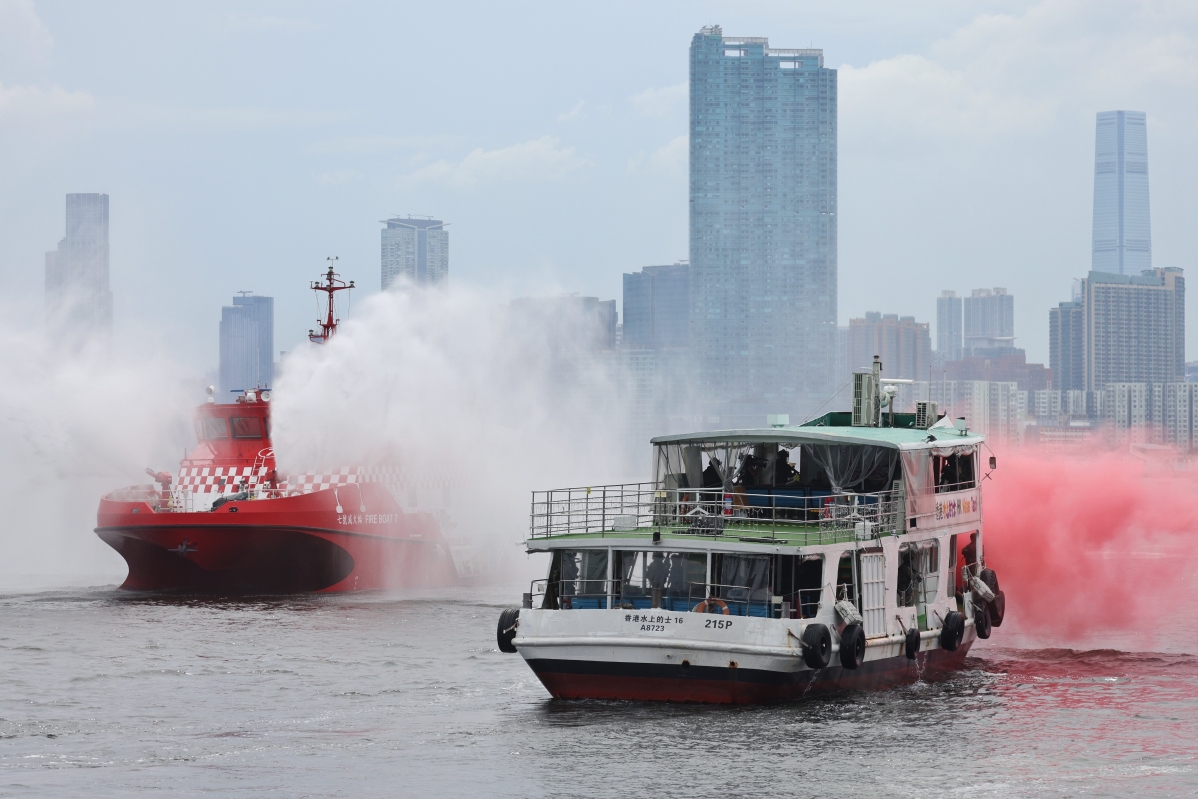 演習模擬一名極端份子嘗試縱火,船頭位置突然冒出火光及濃煙。消防處滅火輪利用遙控水炮控制火勢。 【編輯:洪少葵】