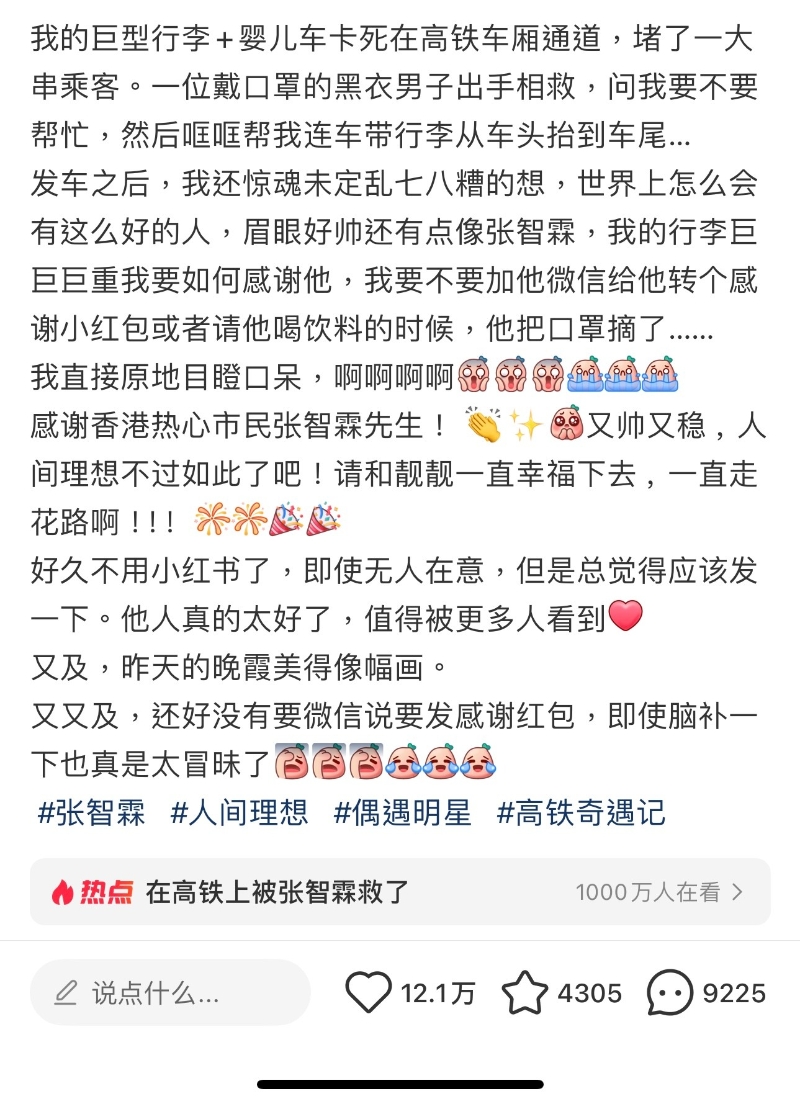 香港新聞網9月8日電  9月7日凌晨,網友“一顆小芝麻”在社交平台發文,感謝“香港熱心市民張智霖先生”。原來,這位內地媽媽在乘坐高鐵時,因帶著嬰兒車和大件行李,不慎卡在車廂通道,導致後方乘客無法通行。就在她手足無措之際,一名戴著口罩、身穿黑衣的男子主動上前,溫聲問她是否需要幫忙,並主動幫她將嬰兒車和行李,從高鐵車頭一路搬到車尾。