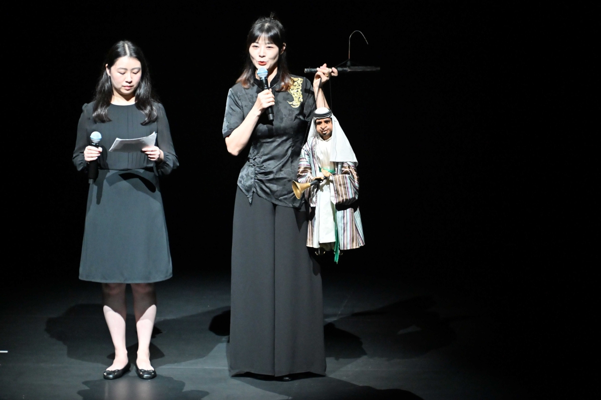 圖為主持人簡介《古藝新姿木偶戲》於2002年榮獲第十屆文華獎,內含七齣經典小戲如《元宵樂》、《小沙彌下山》、《鍾馗醉酒》和《馴猴》等,展現閩南民俗千年技藝。