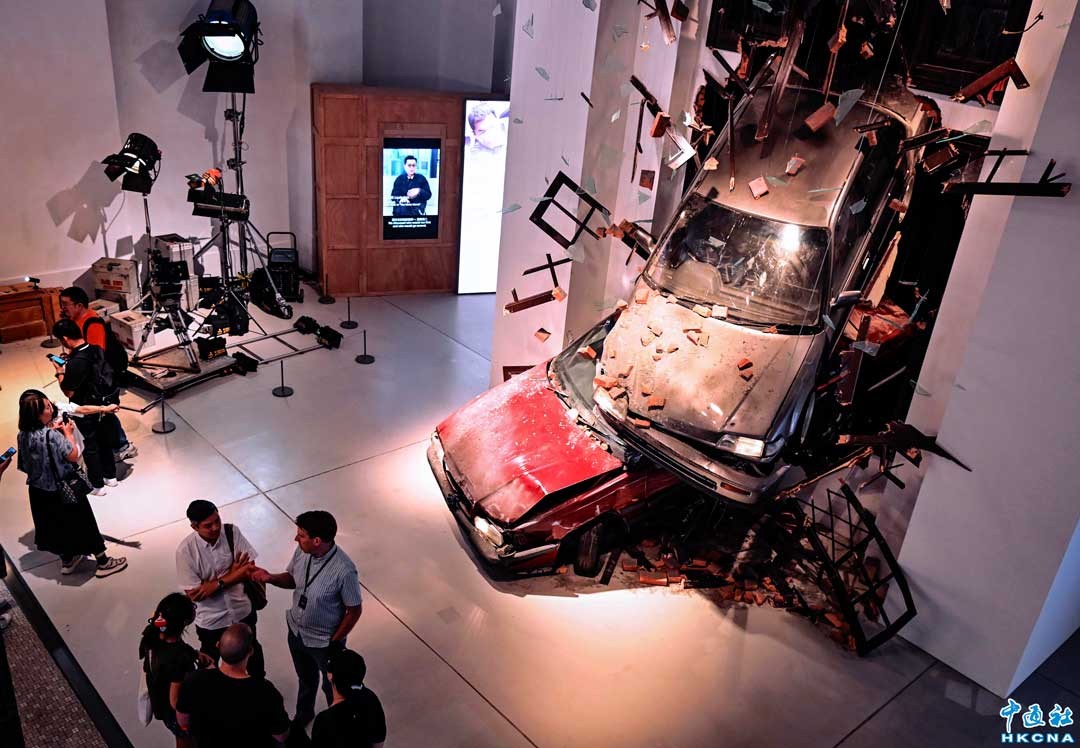 9月11日,不少遊客、市民到中環大館參觀新展《光影邊緣─香港電影的臥底世界》。展覽由8月1日 - 10月5日於大館展出。這次於大館舉行的《光影邊緣─香港電影的臥底世界》透過以上八部經典作品,前所未有地帶觀眾追逐影像里真實中的香港臥底身影。圖為視覺效果最震撼的場景“橫掃片場”,兩輛車破窗而出,四散的木質窗框、玻璃碎片與碎磚被定格在空中。(香港中通社記者 洪少葵攝)