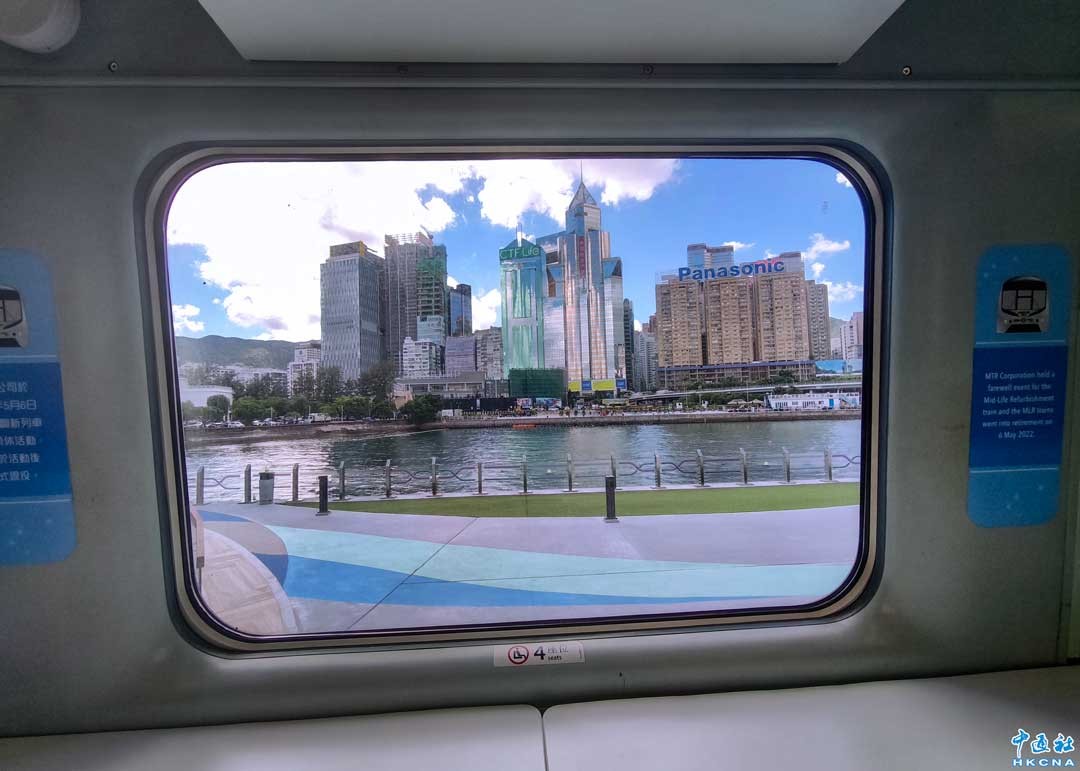 停泊在灣仔“水上運動及康樂主題區”兩卡已退役的東鐵線“烏蠅頭”列車,成為一個具香港特色的新地標和休憩空間。隨著港鐵不斷發展,港鐵公司透過“退役列車保傳計劃”,將兩卡已退役的“烏蠅頭”列車捐贈給發展局,並共同構思將這標誌性的列車重置於灣仔水上運動及康樂主題區,以作展示及公共活動空間。重置的退役列車亦紀念東鐵綫順利延伸過海直連港島,成為香港第四條過海鐵路。圖為列車車窗外望灣仔。(香港中通社記者 洪少葵攝)