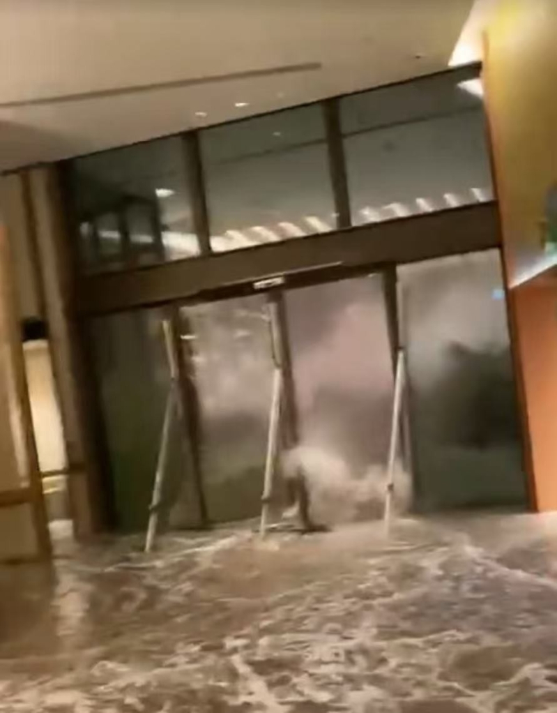 富麗敦海洋公園酒店位於香港仔海洋徑,位處低窪臨海地段。據網上視頻片段,有人被洶湧衝入室內的水流裹挾摔倒,亦有市民發出驚呼,工作人員努力維持現場秩序。玻璃門碎片散落,有工作人員清理地上的泥水和積水。  (完)