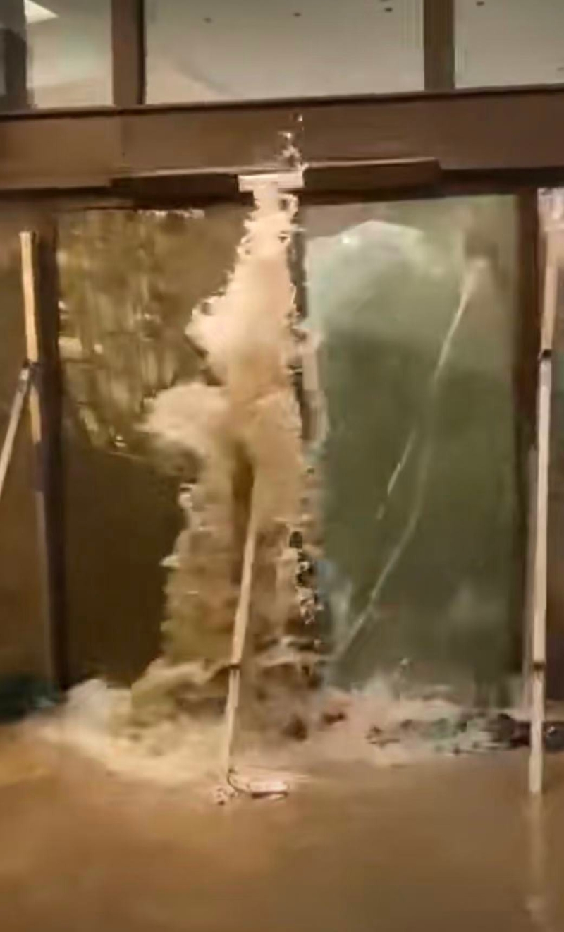 (有片)據報香港富麗敦海洋公園酒店大堂玻璃被水沖爆