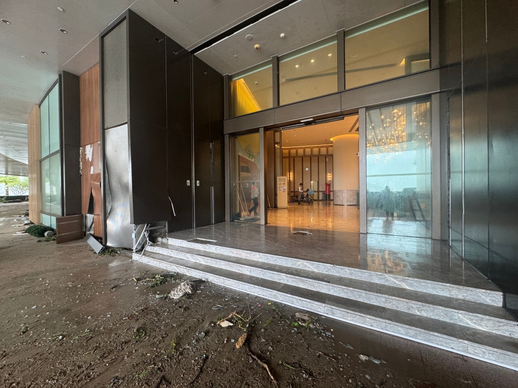 香港新聞網9月24日電 隨著超級颱風“樺加沙”襲港,香港天文台24日凌晨2時40分發出10號颶風信號,這是香港時隔61年後再次出現一年兩發“十號風球”。香港仔海洋徑的香港富麗敦海洋公園酒店24日凌晨4時左右被巨浪沖破大堂玻璃門,夾雜黃色泥沙的海水湧入大堂內,從社交平台上曝光的畫面中可見有人被沖倒。 香港中通社記者24日中午到現場見到,酒店正對的海域仍不時有巨浪湧起,大堂及門外車路一片泥濘,多塊玻璃被擊碎,善後工作正有序進行中,酒店職員輪番到場清理。 香港富麗敦海洋公園酒店風險及安全部經理姚崇智接受香港中通社採訪時表示,這是酒店自2022年開始運行以來遇到的最嚴重的颱風災害,所幸無人員受傷。 姚崇智稱,酒店在“樺加沙”襲港前已根據天文台的呼籲,全力配合政府的防風措施,包括在地上佈置防水閘,但仍低估了颱風的威力。 記者在現場看到,地上的防水閘連同底座一起皆被連根拔起。據悉香港消防處於24日上午8時40分接到求助,曾派員到場協助。
