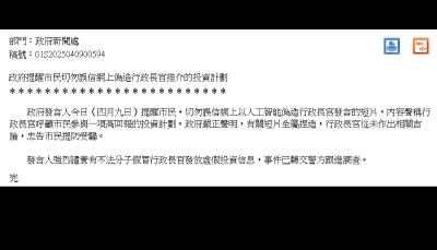 香港新聞網9月25日電 美高梅中國控股有限公司發現有不法分子利用人工智能深度偽造技術,假冒美高梅中國控股有限公司董事長及執行董事何超瓊女士,通過偽造影片散佈所謂新投資計劃的不實信息,聲稱投資者可獲百倍回報。此類虛假內容純屬惡意捏造,與美高梅中國,以及何超瓊女士完全無關。