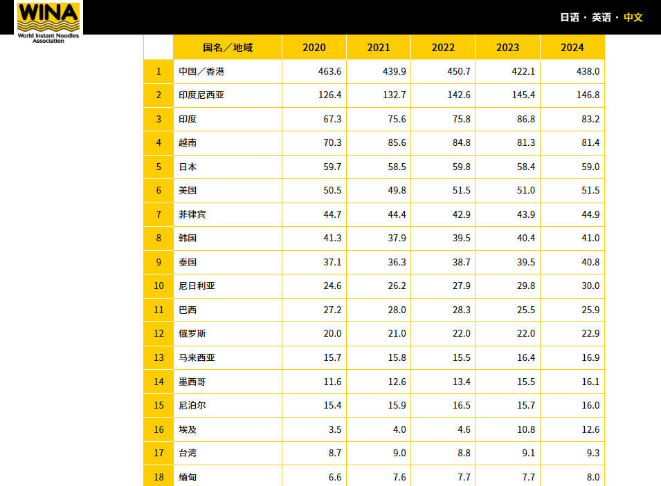 圖源世界方便面協會 印尼則以146.8億份位列第二,印度位居第三,是83.2億份。 數據指,去年全球消費1230.7億份方便麵,創歷史新高。前十名的國家和地區與去年保持不變。 人均消費量方面,越南以每人每年消費81份方便麵位居榜首,韓國以79.2份位列第二,泰國以57份位列第三。中國(含香港)則為31份。 協會指出,香港較受歡迎的方便麵湯底是以蝦和海鮮為主,且茶餐廳早餐和下午茶亦會提供方便麵。中國內地方面,則更流行牛肉湯底,桶麵亦受歡迎。(綜合世界方便麵協會、香港01等) 【編輯:譚暢】