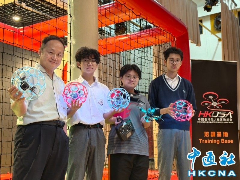 圖為東華三院黃鳳翎中學無人機隊帶隊老師溫亦生(左一)和香港特區代表隊員陳家偉(左二)、何依玲(左三)及陳彥中(左四)。香港中通社記者 梁嘉軒攝