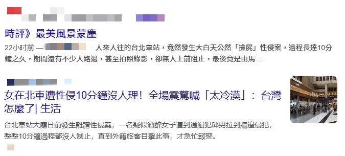 台北車站性侵案傳到香港 輿論震驚:令人心寒香港新聞網10月16日電(編輯 張依珊)台北車站大廳爆出性侵案,一名盜竊通緝犯趁一名來自香港的女遊客醉倒時,將其拖至牆邊性侵,過程長達約10分鐘,期間有人拍照錄像卻無人上前制止,直到一名馬來西亞遊客目擊並報警。此事不僅引起島內高度關注,也讓不少香港網友直呼“台灣社會真冷漠”。