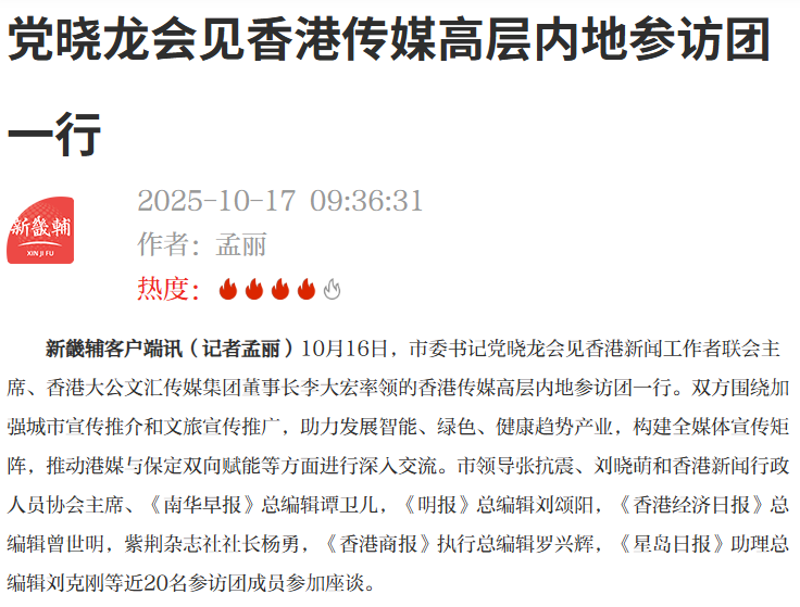 《保定日報》報道,雙方圍繞加強城市宣傳推介和文旅宣傳推廣,助力發展智能、綠色、健康趨勢產業,構建全媒體宣傳矩陣,推動港媒與保定雙向賦能等方面進行深入交流。市領導張抗震、劉曉萌和香港新聞行政人員協會主席、《南華早報》總編輯譚衛兒,《明報》總編輯劉頌陽,《香港經濟日報》總編輯曾世明,紫荊雜誌社社長楊勇,《香港商報》執行總編輯羅興輝,《星島日報》助理總編輯劉克剛等近20名參訪團成員參加座談。(完) 【編輯:紀東】