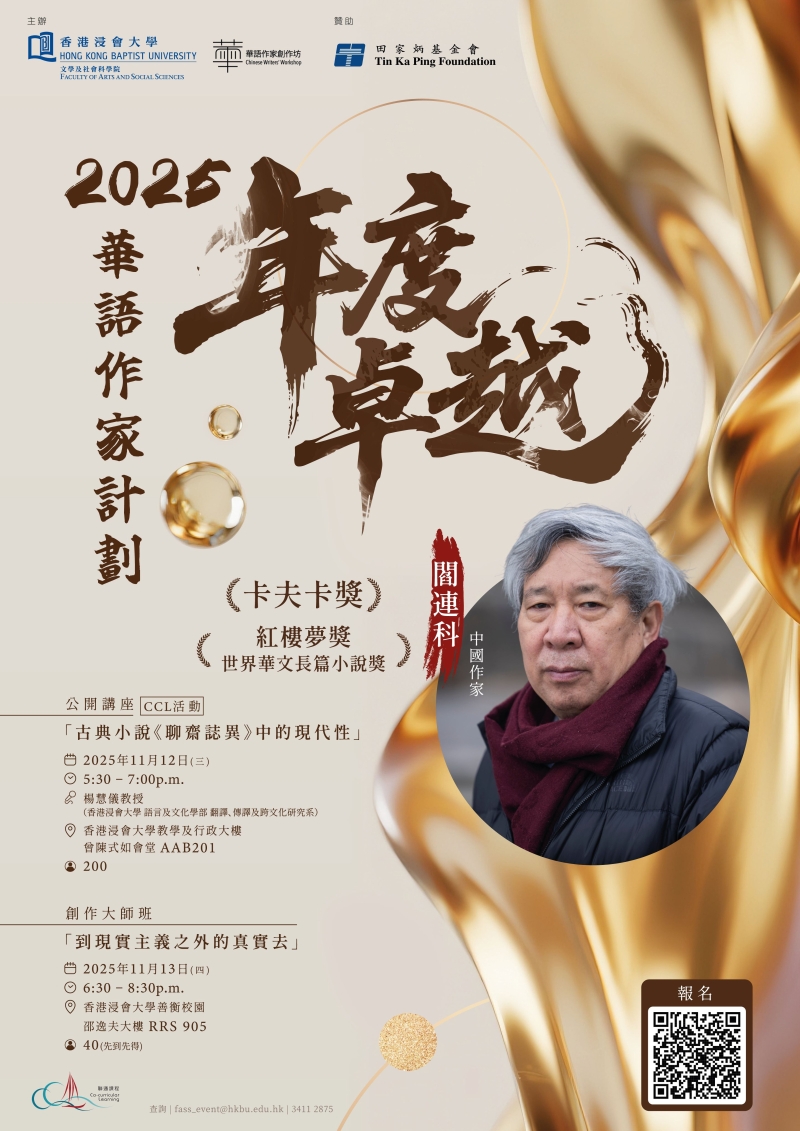 香港新聞網10月21日電 香港浸會大學華語作家創作坊將於11月12及13日舉行“2025年度卓越華語作家系列”,邀得享譽國際的中國內地當代華文作家閻連科先生親臨浸大,主持文學講座及創作大師班,與廣大讀者交流寫作心得。兩項活動均免費開放予公眾參與。 由田家炳基金會慷慨贊助的創作坊,創立於2020年,旨在向社會、國家和世界推廣當代華語文學及文化,展示其多元豐富的面貌。浸大於每年秋季均邀請傑出的華語作家訪校。