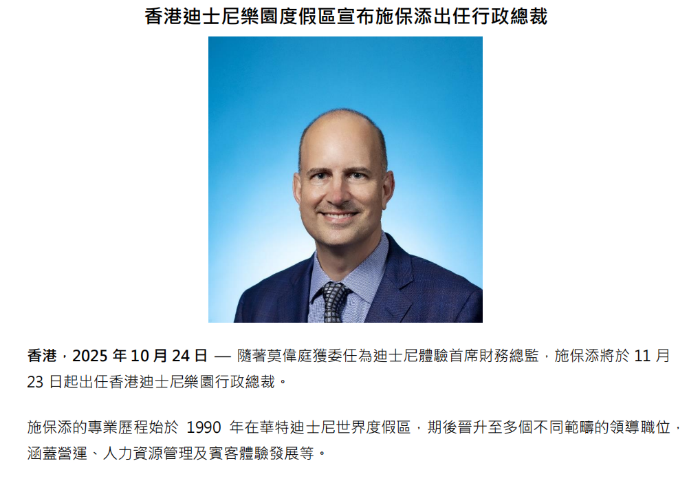 施保添。香港迪士尼樂園度假區發佈文件截圖 施保添的專業歷程始於1990年在華特迪士尼世界度假區,期後晉升至多個不同範疇的領導職位,涵蓋營運、人力資源管理及賓客體驗發展等。 過去五年,施保添擔任香港迪士尼樂園營運高級副總裁,憑藉其穩健的領導能力、營運專業知識及全面的商業觸覺,引領樂園經歷重大革新與擴展,創下破紀錄的業績及卓越的賓客滿意度。 除此領導更新外,施楠將於2026年1月起出任加州迪士尼樂園財務高級副總裁。 施楠亦於1990年代在華特迪士尼世界度假區展開其迪士尼專業歷程,曾在公司內部擔任多個財務職位,涉及範疇包括迪士尼度假旅行、全球業務發展、業務規劃及傳訊等,並曾擔任上海迪士尼度假區首席財務總監。 作為香港迪士尼首席財務總監,施楠在推動樂園長遠發展方面發揮了關鍵作用。憑藉其廣泛的經驗,他將協助進一步推動加州迪士尼樂園的未來發展計劃。 迪士尼樂園國際總裁及董事總經理艾書琳表示:“施保添的任命反映我們對香港迪士尼樂園度假區及整個迪士尼體驗業務持續增長與創新的承諾。他深厚的營運專業知識及具有策略的領導能力,將在我們鞏固現有合作夥伴關係及進一步拓展度假區項目方面發揮關鍵作用。我亦衷心感謝施楠對香港迪士尼樂園度假區的重要貢獻,並祝願他在加州迪士尼樂園的新職位一切順利。”(完) 【編輯:梁嘉軒】