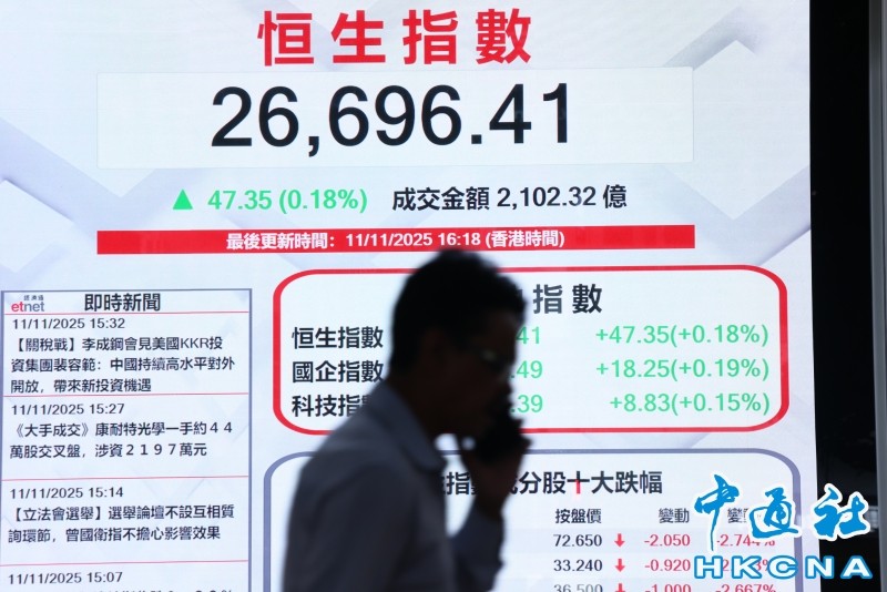香港中通社11月11日電(記者 梁嘉軒)港股11日反覆向上,恆生指數全日收26696點,升47點或0.2%。恆生科技指數報5924點,升8點或0.1%。國指升18點或0.2%,報9461點。大市成交額2102.31億港元。