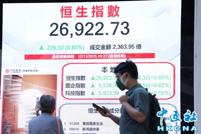 香港中通社11月12日電(記者 梁嘉軒)港股12日造好,恆生指數初段曾突破27000點關口,全日收26922點,升226點或0.8%。